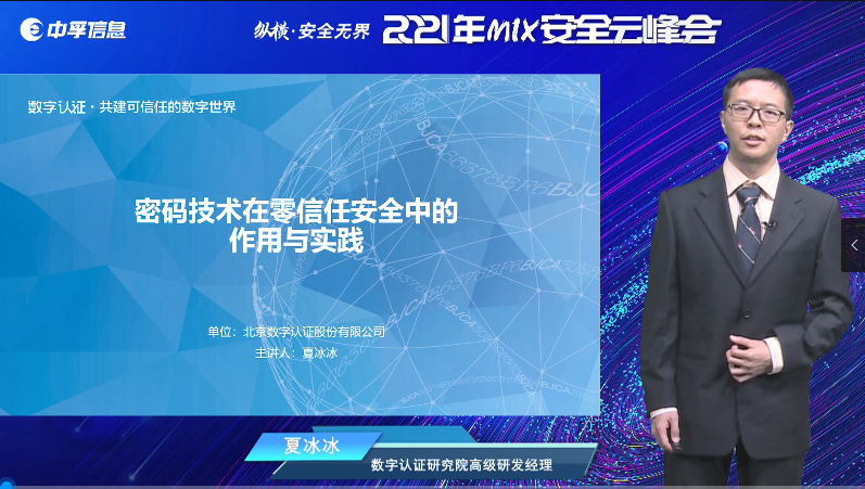 本次大会以线上直播的方式,邀请中国科学院院士沈昌祥等业内大咖,围绕“纵横·安全无界”,探索网络安全的无限边界,激发数字经济活力,把握时代脉搏,解构未来的安全蓝图,筑牢数字安全屏障,共同为国家安全赋能启智。北京bb贝博艾弗森官方网站股份有限公司(以下简称“bb贝博艾弗森官方网站”)研究院高级研发经理夏冰冰博士受邀出席零信任专场会议,并发表“密码技术在零信任安全中的作用与实践”的主题演讲。