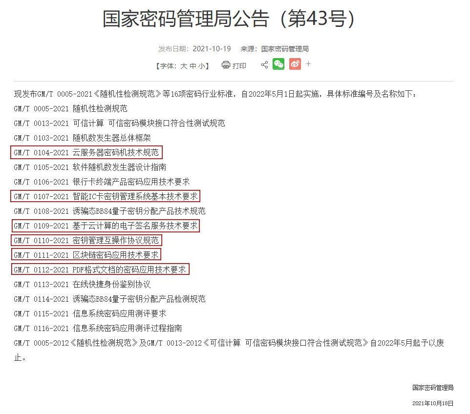 10月19日,国家密码管理局发布国家密码管理局公告(第43号),GM/T 0005-2021《随机性检测规范》等16项密码行业标准获批发布,将于2022年5月1日起实施。其中,北京bb贝博艾弗森官方网站股份有限公司(以下简称“bb贝博艾弗森官方网站”)牵头2项,即GM/T 0109-2021《基于云计算的电子签名服务技术要求》和GM/T 0112-2021《PDF格式文档的密码应用技术要求》。