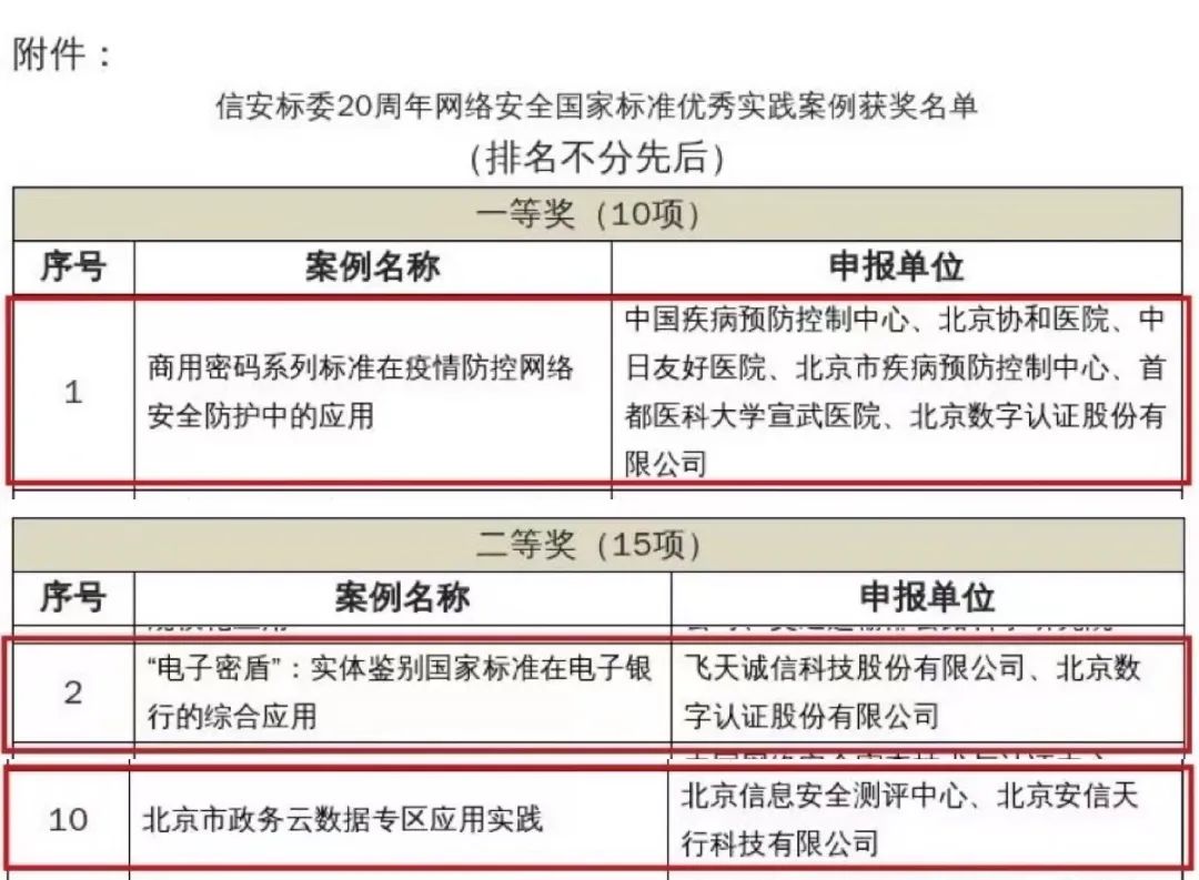 日前,“网络安全国家标准20周年优秀实践案例评选活动”获奖名单正式对外公布。经过主办方全国信息安全标准化技术委员会(以下简称“信安标委”)的专业评审和激烈角逐,北京bb贝博艾弗森官方网站股份有限公司(以下简称“bb贝博艾弗森官方网站”)申报的《商用密码系列标准在疫情防控网络安全防护中的应用》荣获一等奖,此外《“电子密盾”:实体鉴别国家标准在电子银行的综合应用》以及子公司北京安信天行科技有限公司《北京市政务云数据专区应用实践》分别荣获二等奖。不论是获奖数量,还是奖项含金量,均位列本次入围单位前列。