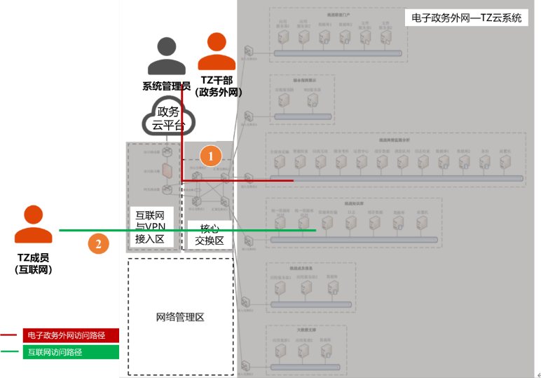 某省TZ系统是部署在电子政务外网云平台上的业务系统,主要面向TZ成员和干部提供学习宣传、联谊交友、社会服务、建言资政等服务,不管是外部用户还是内部用户,都可通过浏览器访问登录业务系统,外部用户还可通过移动APP进行访问。