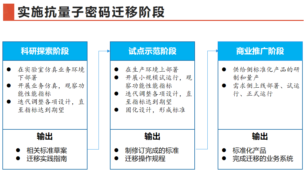 对于如何开展迁移工作,夏鲁宁也给出了自己的观点,他认为首先需要划定业务边界范围,例如需要厘清业务关联、明确业务环境、明晰资产清单;其次需要分析密码应用现状,明确抗量子密码迁移需求,这其中就包括了算法、协议、产品、标准的不同需求;最后才开始制定抗量子密码迁移方案并开始实施。“在理想的情况下,需要经历科研探索阶段、试点示范阶段、商业推广阶段。”