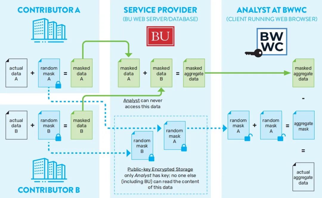 波士顿大学负责计算来自n个数据源的经过掩码处理的数据的总和;