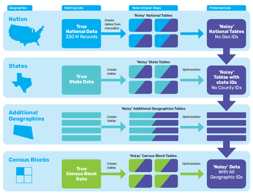 在执行差分隐私的过程中,首先对原始不同类别的数据进行统计分析,这可能包括计算数据的平均值、中位数、标准差等统计信息,以便了解数据的分布和特征。这种统计分析有助于了解哪些数据是敏感的,哪些不是,以及如何在添加噪声时平衡数据的可用性和隐私保护。然后,根据计算出的披露风险和隐私损失预算,向每个单元添加噪声。下图展示了从最大的地理单元(国家)到最小的地理单元(人口普查区域)噪声处理的方法。