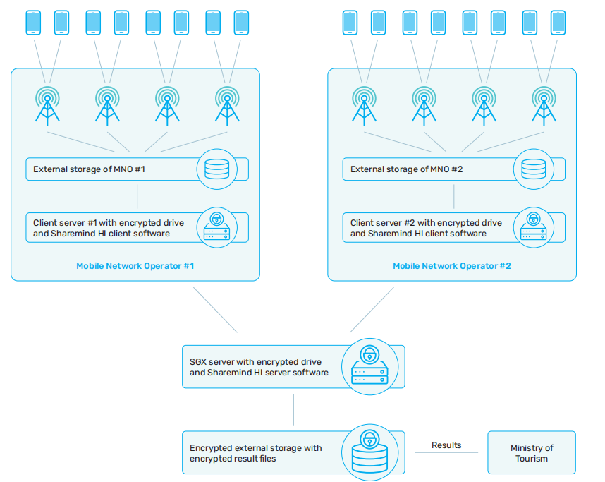 为此,该案例利用Sharemind HI平台提供的可信执行环境(Intel SGX),实现了在不显示共享数据的情况下分析用户在各个运营商的交叉漫游情况以及旅游数据分析。