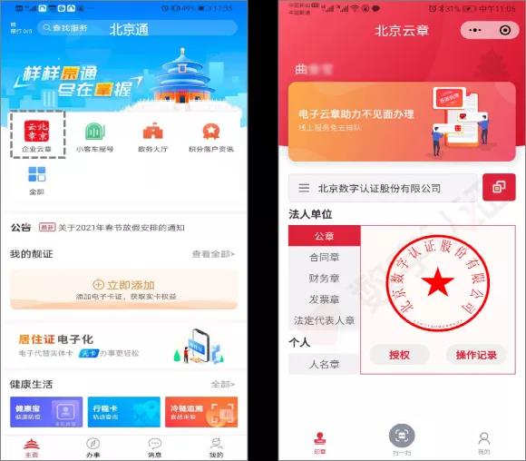 企业通过手机远程使用“电子营业执照”和“北京云章”小程序,线上对开户文件加盖电子印章,电子营业执照即用即验、电子印章即签即审,以电子数据直连交互替代了10余项纸质营业执照信息采集,纸质执照、实物印章和书面文件无需在企业内部、企业与银行之间来回流转,免去了开户申请书、授权书等多份资料的打印用印,简化了客户临柜后的资料录入和审核环节,节约了纸张、人工、时间等企业经营的隐形成本,提高开户效率。