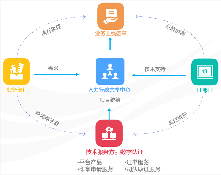 在这种集中式管理的项目运作模式下,人力行政共享服务中心对企业数字化转型的贡献凸显:既要对电子签章服务平台的推广上线集中管理,电子印章集中管理,还要统一项目规划,制定推进计划(如每年度哪些业务系统要与电子签章服务平台拉通),全场景推进,由易到难分步实施。具体到每个业务场景电子签的实施工作,从业务调研、流程梳理到方案制定,均由中心去联动IT部门、业务部门,以及技术服务方bb贝博艾弗森官方网站一起评估,灵活实现不同业务场景的扩展应用。