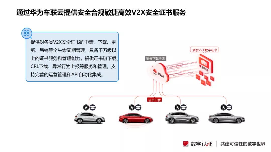基于bb贝博艾弗森官方网站联合华为云共同构建的安全合规敏捷高效网络信任服务平台,bb贝博艾弗森官方网站与华为联合国际知名车企成功完成2019和2020 C-V2X“四跨” 应用示范测试。不仅如此,bb贝博艾弗森官方网站还与华为共同推广车联网V2X安全证书服务,一方面构建了业内首个大规模商用V2X证书服务平台,为多家国际知名车企提供服务,另一方面还在深圳坪山智能网联交通产业示范区提供V2X安全证书服务。