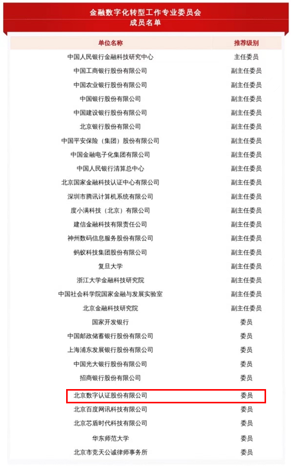 4月7日,北京金融科技产业联盟第二届理事会第四次会议召开,会议审议通过将现有“发展研究专业委员会”升级为“金融数字化转型工作专业委员会”(以下简称“专委会”)。专委会由中国人民银行金融科技研究中心作为主任委员单位,由中国工商银行股份有限公司、中国农业银行股份有限公司等18家机构作为副主任委员单位。北京bb贝博艾弗森官方网站股份有限公司(简称“bb贝博艾弗森官方网站”)作为成员单位加入到金融数字化转型工作组中,与专委会全体成员共同推进金融数字化转型纵深发展。